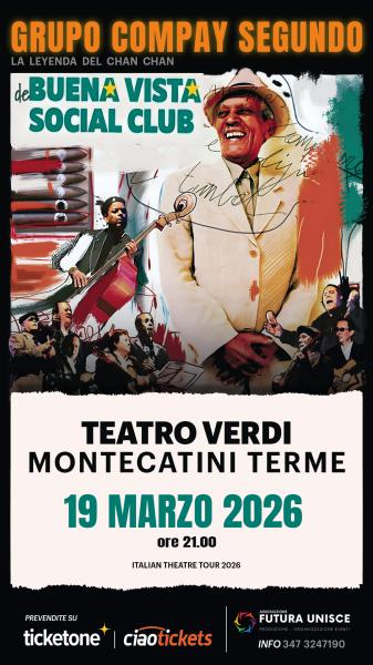 Grupo Compay Segundo in concerto al Nuovo Teatro Verdi – 19 marzo 2026 Il fascino, la tradizione e il ritmo del vero son cubano arrivano a Montecatini Terme: giovedì 19 marzo 2026 il Nuovo Teatro Verdi ospiterà il celebre Grupo Compay Segundo, la storica formazione riconosciuta come erede ufficiale dell’universo Buena Vista Social Club. Dicono che i grandi musicisti non scompaiano mai davvero. Nel caso di Compay Segundo, è verità evidente: la sua voce, la sua ironia, il suo “son” – quintessenza della musica cubana – continuano a vibrare oggi nel Grupo Compay Segundo, guidato dal figlio e contrabbassista Salvador Repilado, ultimo testimone diretto del leggendario progetto Buena Vista Social Club. il Grupo Compay Segundo rappresenta oggi l’unico depositario vivente dello stile, del repertorio e dell’autenticità musicale cubana che ha conquistato il mondo e che continua a emozionare spettatori di tutte le generazioni. Il concerto sarà una full immersion nella cultura cubana, tra brani iconici, arrangiamenti storici e atmosfere che rimandano ai vicoli di Santiago de Cuba, al sapore nostalgico delle serenate, fino all’inconfondibile poesia popolare fatta di ritmo, ironia e romanticismo. Fra i brani in programma: Chan Chan, Macusa, Sarandonga, Sabroso, El Cuarto de Tula, Veinte Años, Lágrimas Negras, Quizás, Quizás, Quizás e altri capolavori del repertorio tradizionale.